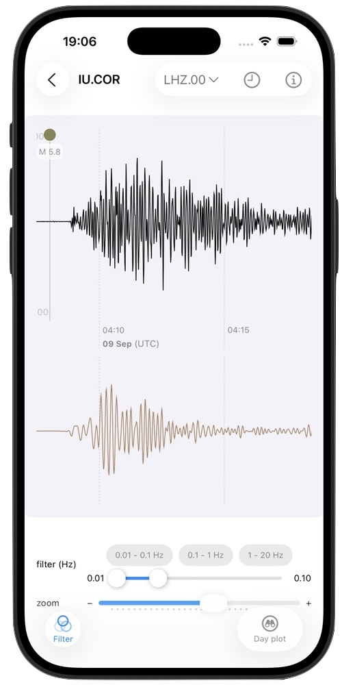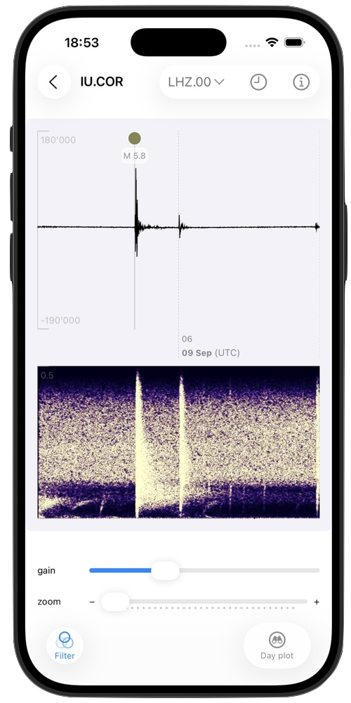 Pinch, zoom (single-tap to select zoom window, double-tap to reset) and pan through high-resolution seismic waveforms